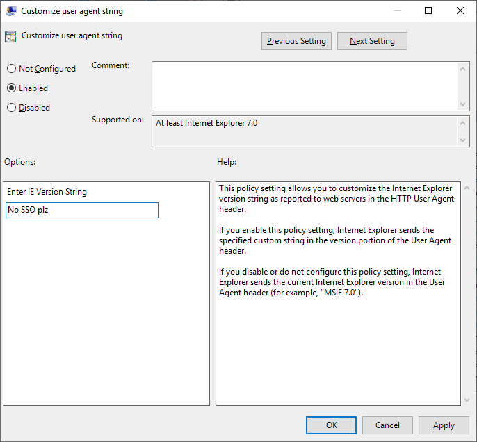 Crap. Instead of FBA we’re redirected back to the Office 365 logon page, but you might get an error message instead. I haven’t looked at the HTTP headers but I figure that the GPO itself doesn’t actually replace the user agent with what you specify, instead adding to it. Hmm…