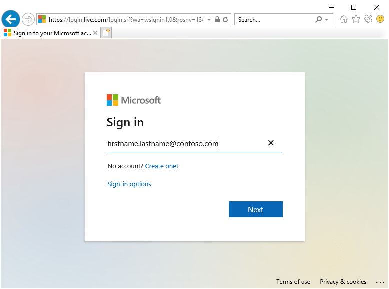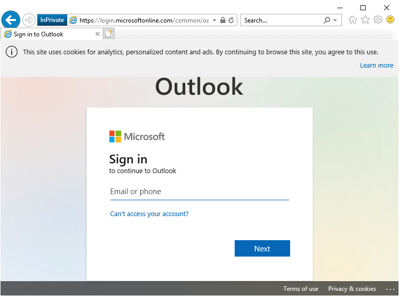 Clicking the Sign in button forwards the user to login.live.com, where the user is asked to enter their e-mail address. Now this might not seem like SSO, but is simply because Microsoft cannot figure out how to authenticate you otherwise. Specifically for outlook.com, you can instead browse to outlook.com/<yourdomain>, and it will redirect you to your AD FS farm if you have federation enabled for Office 365.