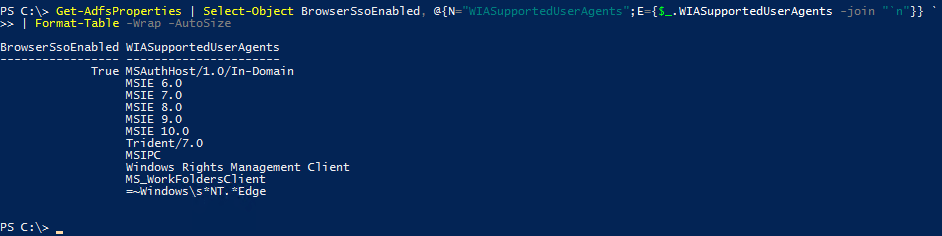 Get-AdfsProperties | Select-Object BrowserSsoEnabled, @{N="WIASupportedUserAgents";E={$_.WIASupportedUserAgents -join "`n"}} | Format-Table -Wrap -AutoSize